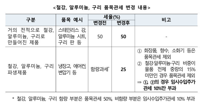 µÑ°, ºÎ¼Ó¼¸¦ ÅëÇØ ǰ¸ñ°ü¼¼ ºÎ°ú ¹× Á¦¿Ü ´ë»ó ǰ¸ñÀ» ¹Ì±¹ ǰ¸ñ¹øÈ£ (HTS) ±âÁØÀ¸·Î »õ·ÎÀÌ °øÁöÇÏ¿´´Ù. ¿¹¸¦ µé¾î ³ÃÀå°í, ¿¡¾îÄÁ, º¯¾Ð±â µîÀº ö°, ¾Ë·ç¹Ì´½, ±¸¸®ÀÇ ÇÔ·®°¡Ä¡¸¦ ±¸ºÐÇÒ ÇÊ¿ä ¾øÀÌ 25% °ü¼¼°¡ ºÎ°ú µÇ¸ç, ÈÀåǰ, Çâ¼ö, ¼Òȱ⠵îÀº ö° ǰ¸ñ°ü¼¼ ´ë»ó¿¡¼ Á¦¿ÜµÈ´Ù.